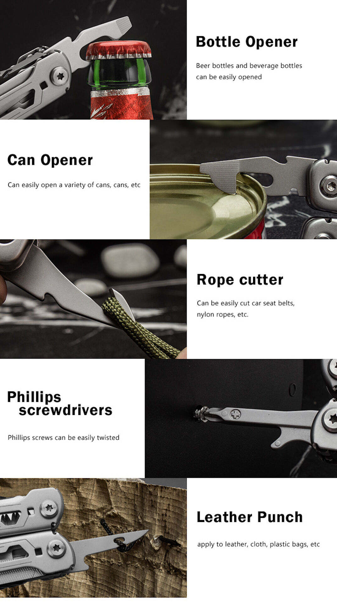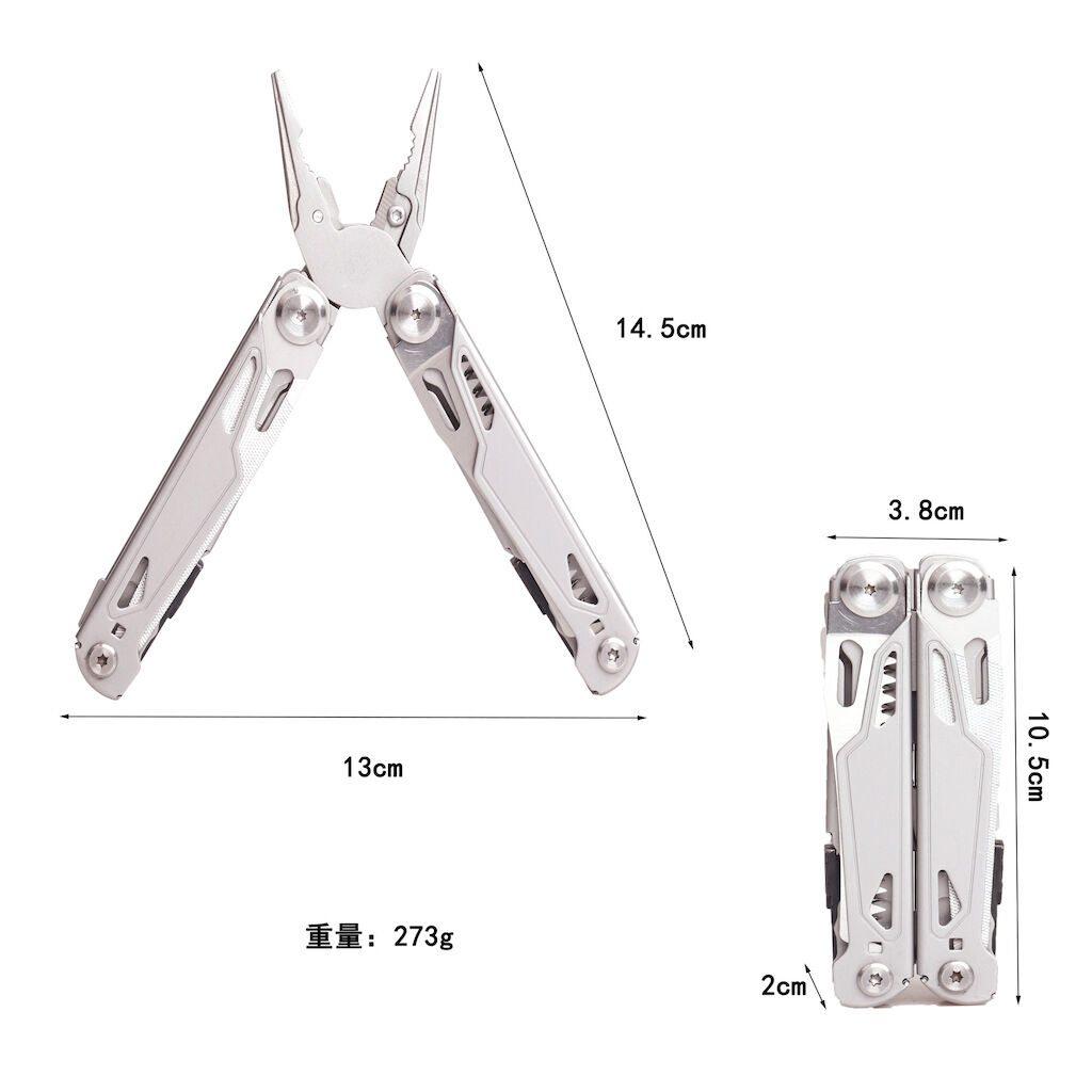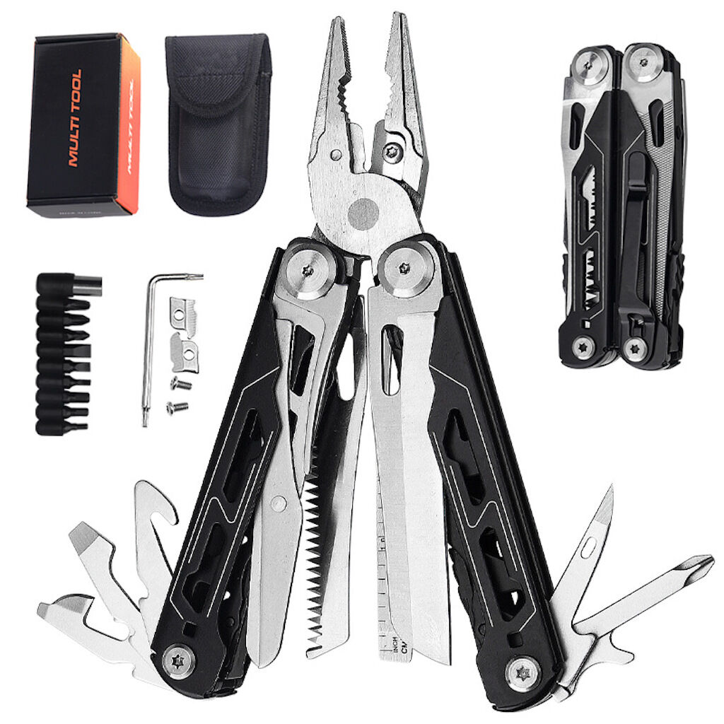 MULTITOOL EDC 19-IN-1: multialat, fitur tang hidung jarum, pengupas kawat, driver flathead besar/kecil/Sedang/, 2 driver silang, awl, kikir kuku, gunting, kunci alat, pembuka kaleng, pembuka botol, pisau bergerigi 2.25"
